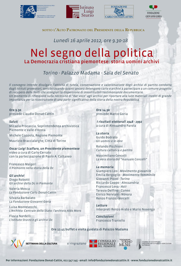TORINO – Nella Sala del Senato, in piazza Castello, lunedì 16 aprile dalle ore 9.30 si svolgerà il convegno “Nel segno della politica. La Democrazia cristiana piemontese: storia, uomini, archivi”, dalle ore 9.30 alle ore 18.00. Sotto l’alto patronato del presidente della Repubblica l’iniziativa è organizzata da Istituto Luigi Sturzo, Fondazione Carlo Donat-Cattin, Fondazione Giovanni Goria, e promossada MIBAC.