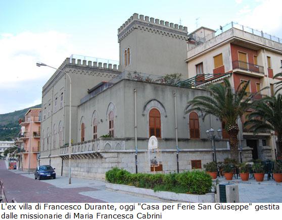 Il posto, già di per sé molto ameno, diventa poi veramente unico ed entusiasmante non appena si “vive la casa” attraverso la presenza gentile e discreta, ma accogliente, delle suore con l’aria salubre tonificante del mare che si respira sulla grande terrazza: un vero toccasana in cui la natura entra in sintonia con la spiritualità dell’ambiente per dare agli ospiti una sinergia di vita nuova, per giunta alla portata di tutti e aperto in ogni periodo dell’anno. Per gustare questo salutare piacere trascorrendo un rigenerante periodo di riposo si può telefonare al numero 094236135 della «Casa per ferie S. Giuseppe», un tempo villa di Francesco Durante, gestita dalle missionarie di Madre Cabrini. Un perfetto connubio che pare esprimere la volontà del grande medico nell’offrire la sua casa per il nostro benessere fisico e spirituale.