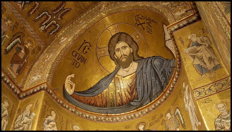 Attraversata la porta, salendo i gradini dapprima il loro sguardo si soffermava sulle rappresentazioni situate in basso poi si innalzava verso l’alto e repentinamente si fissava sul Pantocratore.  Il Pantocratore infatti è posto nel catino absidale ed è in una posizione quasi concentrica degli archi come per dire “guarda qui”. È tutto d’oro perché l’oro significa il Cielo, ovvero ciò che esprime luce da sé e non perché sia illuminato. Questo è in generale anche il significato dell’oro presente in tutte le icone bizantine. Ai tempi del Medioevo non c’èra l’odierna pavimentazione: il pavimento era scuro, buio, realizzato con mattoni grezzi. Anche la parte inferiore della parete era grezza e scura. Perciò a quell’epoca il contrasto tra la parte superiore e quella inferiore era ancora più evidente di adesso. L’oro spiccava sul nero delle altre parti della struttura.  Questo grande contrasto era stato voluto per evidenziare che ciò si trova in basso rappresenta la Terra, ciò che sta in alto e risplende è il Cielo. La differenza era così evidente che i pellegrini non potevano sbagliare. Dunque tutta la struttura era stata concepita come metafora della realtà celeste, come segno che richiamava costantemente la bellezza dell’evento salvifico.