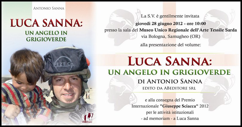 Il 28 giugno 2012 – alle ore 10,00 – presso la Sala del Museo Unico Regionale dell’Arte Tessile Sarda, Via Bologna – SAMUGHEO (OR) sarà presentato il volume di poesie “Un Angelo in Grigioverde” di Antonio Sanna scritto in memoria del figlio Luca Sanna, un soldato coraggioso morto in Afghanistan il 18 gennaio 2011 colpito a morte da un infiltrato nell’esercito afghano nell’ambito del presidio dell’avamposto Highlander nei pressi di Bala Murghab, in Afghanistan.