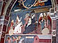 Nel porticato del chiostro, lato nord, campeggia il più importante affresco di Vezzolano, una delle più note pitture del Piemonte antico, datata XIV secolo.La raffigurazione è divisa in quattro parti: dall’alto il Redentore con gli emblemi degli evangelisti; Betlemme con la sacra famiglia ed i magi adoranti. Sotto, in posizione centrale, c’è la sezione più affascinante dell’affresco: da un sepolcro scoperchiato si rizzano tre scheletri, un personaggio inorridito (Carlo Magno?) sta davanti a due cavalieri esterrefatti, mentre un monaco lo invita a chiedere aiuto alla Madonna. Ci sono poi altri resti di affreschi, figure di santi, guerrieri e cavalieri, simboli nobiliari ed emblemi degli evangelisti, sulle cui attribuzioni si sono cimentate più scuole di pensiero.
