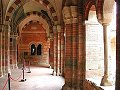 Vezzolano è bellissima, se vi fermate ad ammirarla, ora che finalmente sono finiti i restauri e spariti i ponteggi, dall’alto della strada che scende al parcheggio, non potrete fare a meno di contemplare l’armonia del complesso, il campanile a sinistra, come vuole il romanico, i coppi rossi, la campagna intorno, che in primavera è verde punteggiato dai fiori bianche degli alberi di ciliegio. La chiesa fu costruita fra il XII e il XIII secolo, e rimaneggiata in seguito; originariamente era a tre navate, ognuna terminante con un’abside semicircolare; in un’epoca imprecisata, ma comunque antica, la navata di destra fu chiusa, e aperta dal lato opposto, a formare il lato nord del chiostro.