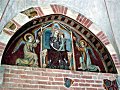 La facciata è decorata da capitelli e statue: due serafini o cherubini e piatti in terracotta decorata, o patere, simbolo dell’ospitalità. Notare il cotto intercalato dagli strati di arenaria, ricchissimi di fossili. L’aspetto dell’interno, con gli archi fra le colonne e le volte a sesto acuto, appartiene al primo periodo gotico. Molto sobria è la decorazione scultorea, che comunque contiene autentici capolavori, come le figure dell’Annunciazione, ai due lati della finestrella centrale dell’abside.