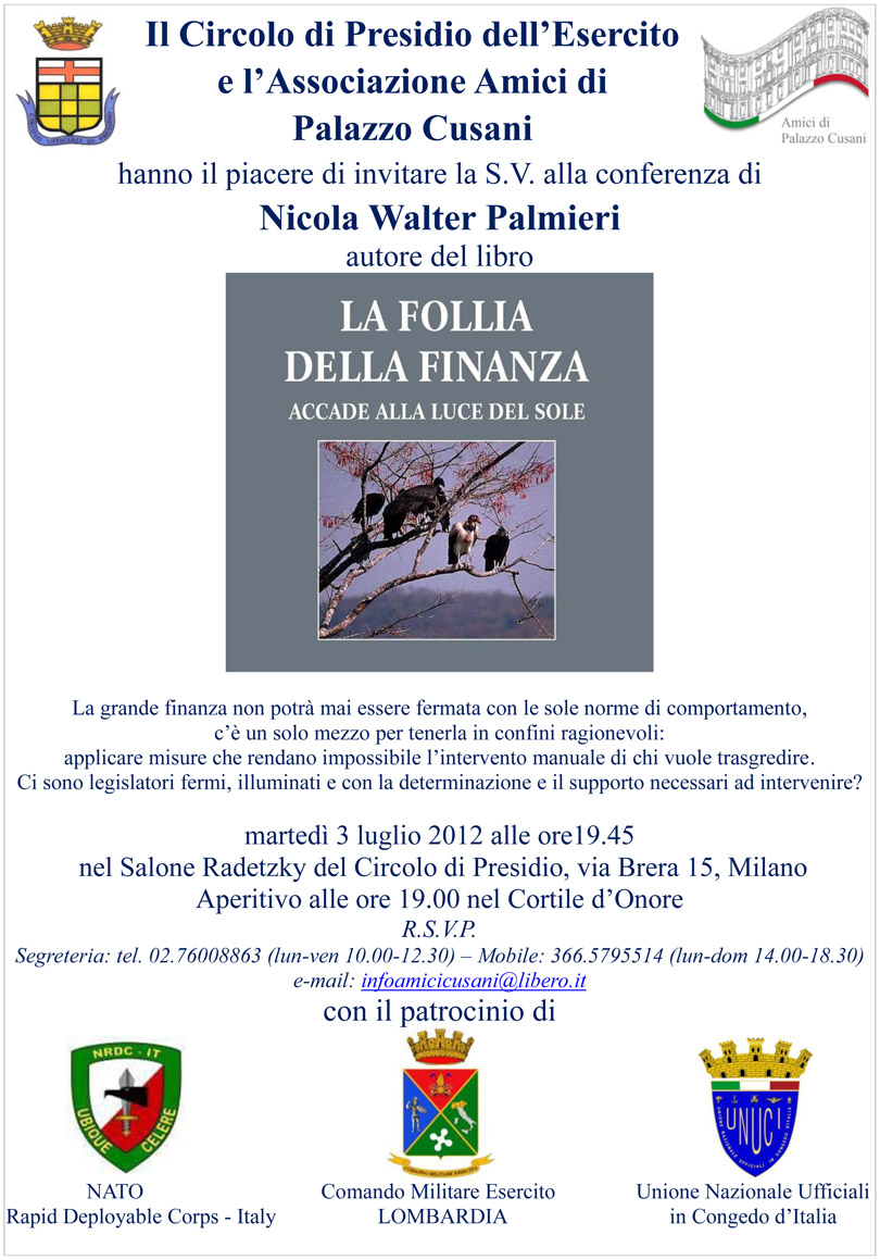 Oggi martedì 3 luglio 2012 alle ore 19.45 nel Salone Radetzky del Circolo di Presidio dell’Esercito Lombardia, via Brera 15, Milano – verrà presentato uno dei libri più interessanti che sia stato pubblicato: La Follia della Finanza di Nicola Walter Palmieri – Ed. CEDAM.