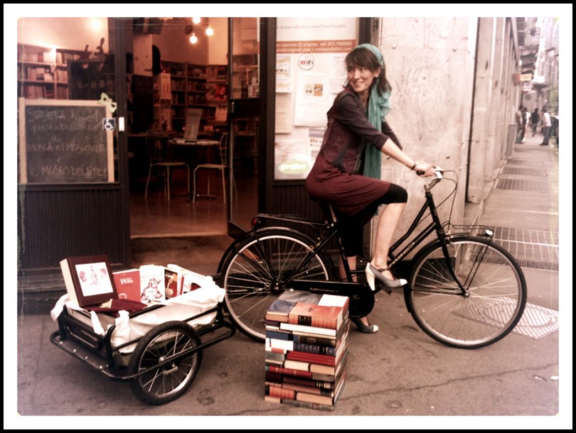 Da tre anni, ogni giorno, inforca la bici carica di libri e pedala sino in centro città, tempo permettendo. La zona d’elezione è piazza Carignano: può capitare di vederla lì, o nelle vie intorno, seduta nel suo salotto letterario a osservare. Se decidi di fermarti, Chiara ti legge una pagina dei suoi tanti libri.  Di certo non passa inosservata, con l’abbigliamento vintage e l’immancabile bicicletta alle sue spalle. Quella che era un’abitudine d’infanzia, di leggere ad alta voce e ascoltare, è diventato un mestiere. “Sono un’artista professionista da 14 anni; ma prima facevo teatro di figura. Da tre anni ho deciso di unire la mia passione per la lettura al teatro: così è nato il mio progetto”.